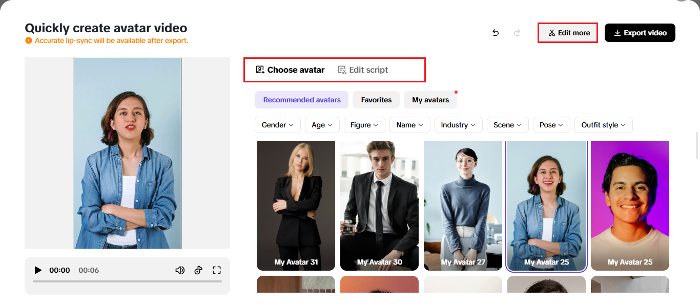 Select “Edit script” to edit the text and timing of the script to match your avatar selection. Choose the language and type of captions that best match your audience. If you select additional settings, choosing your pre-programmed avatars use the “Edit more” choice under “Audio”. Through the “Settings” panel, you can adjust avatar visuals and framing settings to ensure your digital presenter fits your purposes.